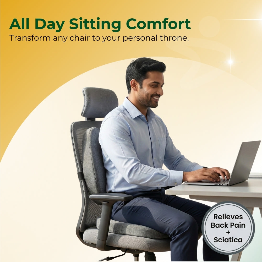 Posture perfected for every seat, the KUSHO Posture Pro Combo transforms ordinary chairs into a pro-level experience keeping your spine naturally aligned from tailbone to lower back. The Tailbone Pro Cushion and Lumbar Back Pro Cushion work together to ease pressure points, redistribute weight, and encourage effortless upright posture. Long hours of sitting feel lighter fatigue and discomfort fade and every seat becomes a balanced comfortable haven for your body.
